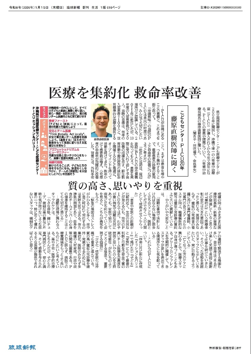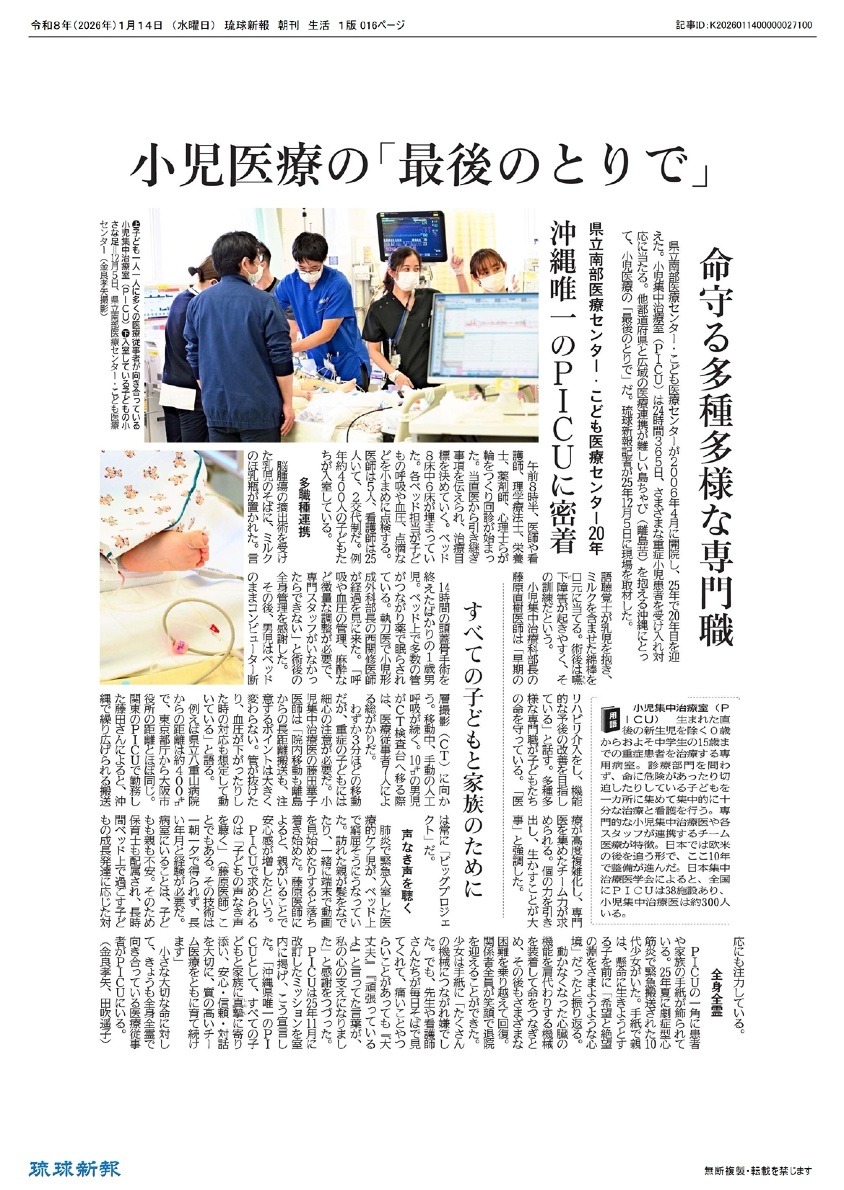琉球新報にPICUに関するインタビュー記事が掲載されました。